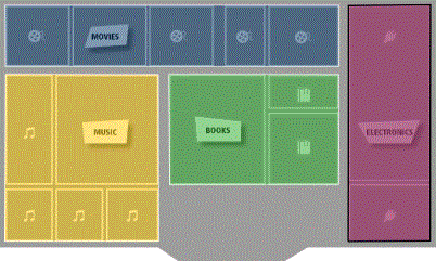 You can add an Image Layout widget to a document to display an image overlaid with colored areas or bubble markers. For example, you can display a map of the United States, with a bubble marker displayed over each state. You can have states with a high number of stores displayed using large bubble markers, and states with a low number of stores displayed using small bubble markers. As another example, you can display the layout of a store in the widget, with each aisle displayed as a separate region, then have MicroStrategy automatically color each aisle based on the number of visits each aisle receives. The image below shows an Image Layout widget with a map of a store, in which each section of the store is displayed as a separate colored region.