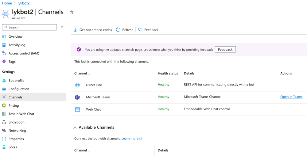 In the right pane, click Microsoft Teams to add your bot. You may need to scroll down to see the list of all Available Channels.