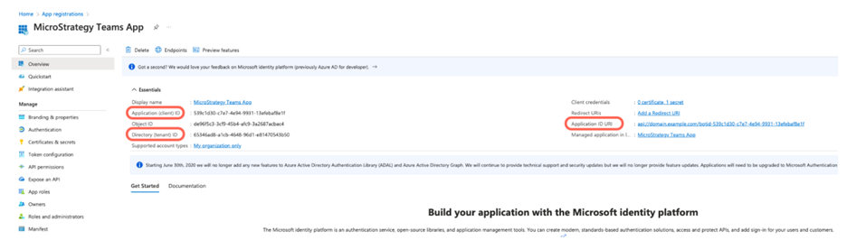 - 복사애플리케이션(클라이언트) ID및디렉터리(테넌트) ID Teams 추가 기능 구성 페이지에서 나중에 사용하기 위해 값을 에 변경합니다.