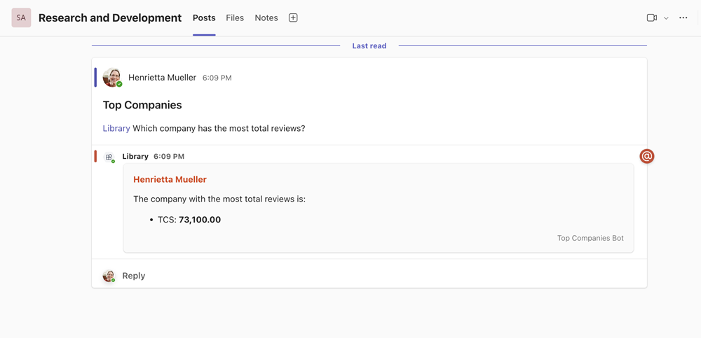 Library Teams 앱을 그룹 채팅에 추가하고 Library에 태그를 지정하여 데이터 관련 질문을 합니다.