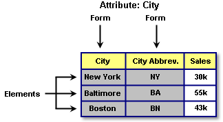 Attribute elements are the unique sets of information or values of an attribute. For example, in the following diagram, Customer is the attribute and New York NY, Baltimore BA, and Boston BN are elements of the attribute City: