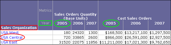 The display of attributes and their attribute elements is also affected by the location of the metrics on the report. The report above uses the common practice of putting the metrics (Sales Orders Quantity (Base Units) and Cost Sales Orders) on the columns of the report.