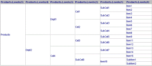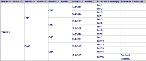 This VLDB property is useful only for MDX cube reports that access an Oracle Hyperion Essbase MDX cube source. To help illustrate the functionality of the property, consider an unbalanced hierarchy with the levels Products, Department, Category, SubCategory, Item, and SubItem. The image below shows how this hierarchy is populated on a report in MicroStrategy.