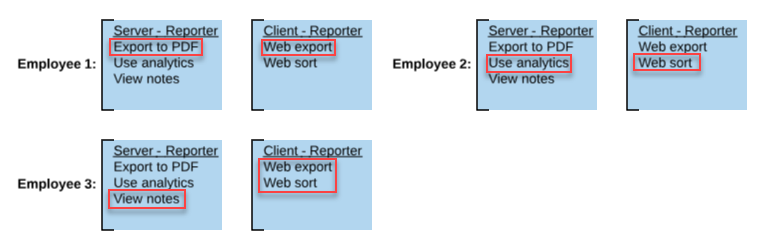 This enterprise has 2 Server - Reporter and 2 Client - Reporter licenses, so it may initially seem like they are out of compliance since all three employees use both license types. However because of the hierarchies described above, the Server - Intelligence license inherits the privilege set of the Server - Reporter license, and the Client - Web license inherits the privilege set of the Client - Reporter license. This means that any privileges mapped to the Server - Reporter or Client - Reporter licenses can also be mapped to the Server - Intelligence or Client - Web licenses.