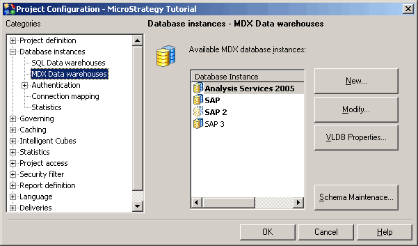 • 데이터베이스 인스턴스와 연결된 MDX 큐브 스키마가 언제 프로젝트에 로드될지 선택할 수 있습니다. 기본적으로 MDX 큐브 스키마는 MDX 큐브 리포트가 실행될 때 필요에 따라 로드됩니다. Intelligence Server가 시작될 때 MDX 큐브 스키마를 로드하도록 선택할 수도 있습니다. MDX 큐브 스키마가 로드되는 시간의 설정에 관한 내용은 MDX Cube Reporting 도움말를 참조하십시오.