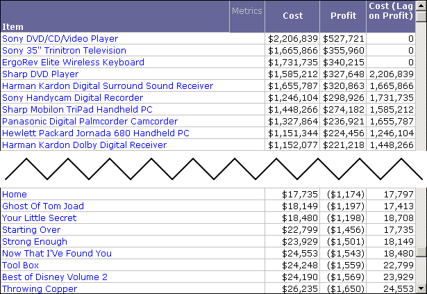 The Cost (Lag on Profit) values are displayed three behind the Cost metric, and are displayed based on the descending sort order of Profit. Notice that with an offset of three, the first three entries for Cost (Lag on Profit) use the default value of zero. Also, the last three values of Cost are not included in the Cost (Lag on Profit) metric.