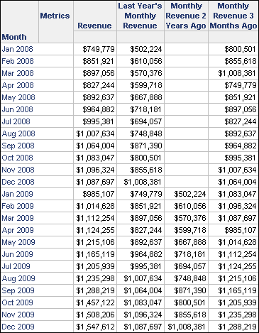 The report shown above allows side-by-side comparison of monthly revenue for three different time periods. In this report, the Monthly Revenue 2 Years Ago metric displays no data for months in the year 2008 because no revenue data exists for the year 2006.
