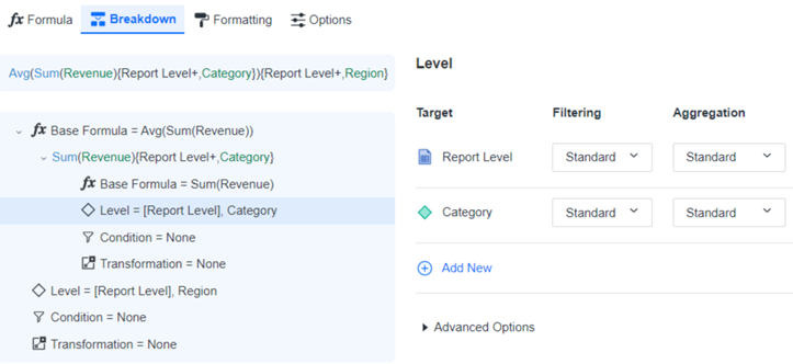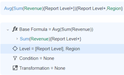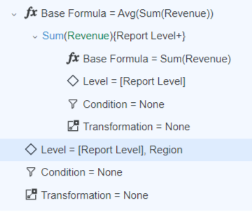 The inner formula, Sum(Revenue), calculates the revenue at the Category level. The outer formula then calculates the average of the resulting values at the Region level. In the Metric Editor, the inner formula appears as a child of the outer formula, as shown below: