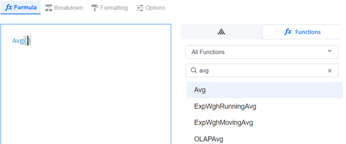 In the Functions pane, search for and then double-click the function for the outer formula. A nested metric uses aggregation functions in both its inner and outer formulas. To continue with the example in the introduction, you select the Avg function.