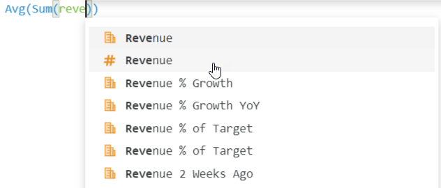 In the Formula pane, begin typing the object that the inner function will act on. Select the object's name. Be sure to add the object between the parentheses () of the inner formula. To continue with the example in the introduction, you select the Revenue fact.