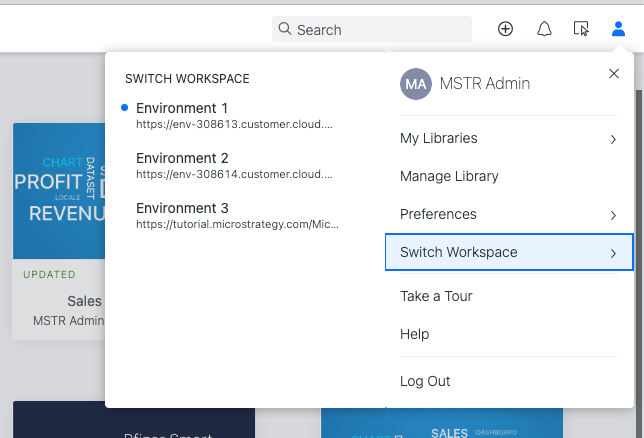 Starting in MicroStrategy 2021 Update 9, you can enable access to multiple environments in Library Web.