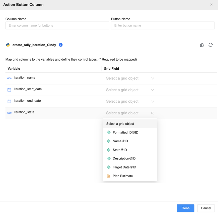 Depending on the action the creator wanted the button to trigger, you can select a standard Python or transaction Python script. For both script types, map the grid columns to variables.