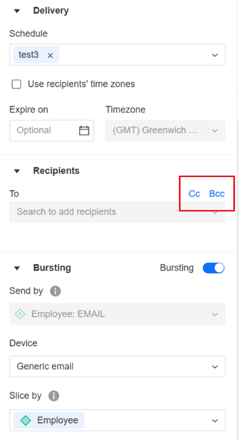 Beginning in Strategy One (December 2025), you can Cc and Bcc users and contacts. Click Cc or Bcc and select the recipients.