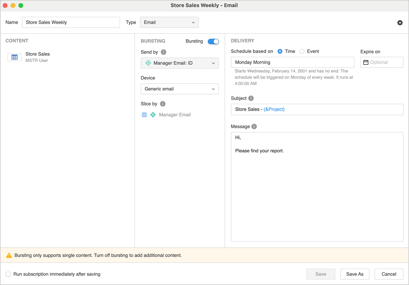 Bursting in Strategy distribution services allows administrators to send reports, dashboards, and documents to a dynamic list of recipients with data sliced by a user’s email. Bursting is used when you must send personalized slices of data to multiple users with each user having a definite access to the data based on the user’s security in the system. Bursting allows easy distribution of data to multiple recipients dynamically and delivers data in a single report execution enhancing the performance.