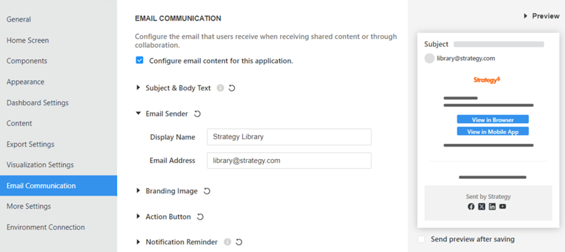 Starting in MicroStrategy 2021 Update 8, the Application editor allows administrators to customize the notification email that users receive when content is shared in Library or when they are sent a message via collaboration. Use this feature to provide a white-labeled experience for different organizations or groups of users, including when you embed Library in your own application.