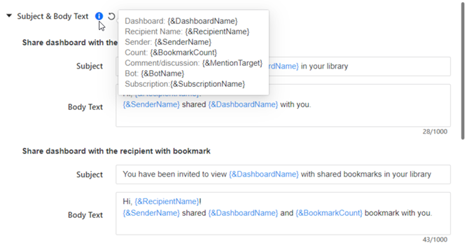 The subject and body text are automatically created for different notification types, using dynamic text to include the dashboard name, recipient name, and other information. To view a list of dynamic text, click the information icon
