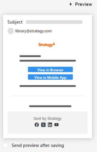 Beginning in Strategy One (June 2025), you can determine whether links to update the subscription and unsubscribe are included in the subscription email. The update subscription link opens the subscription in Strategy Library. The unsubscribe link opens Strategy Library and automatically unsubscribes the user. These links work in the Library browser on a computer or mobile device, not in the Library Mobile app. In addition, the user must have the correct privilege to update the subscription and the subscription must allow recipients to unsubscribe.