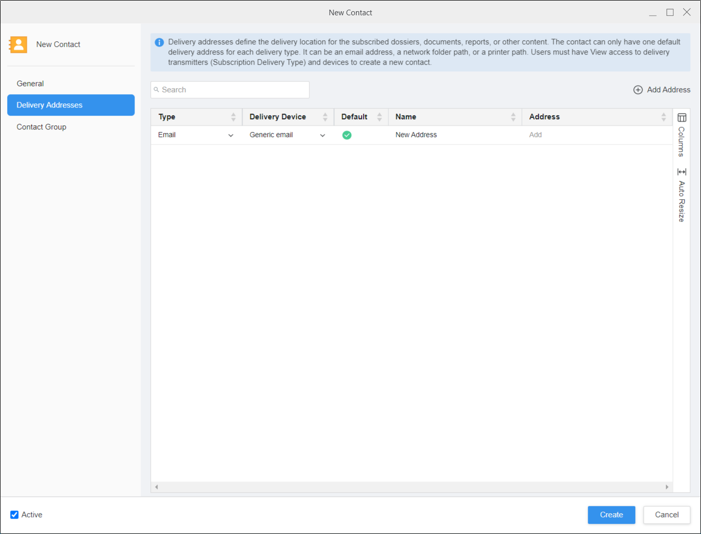Delivery AddressesDelivery addresses define the delivery location for the subscribed dashboards, documents, reports, or other content. The contact can only have one default delivery address for each delivery type. It can be an email address, a network folder path, or a printer path.