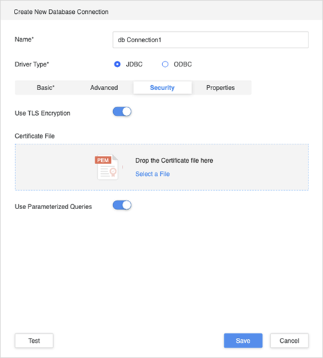 PropertiesAfter completing all fields, click Test and Save your connection.