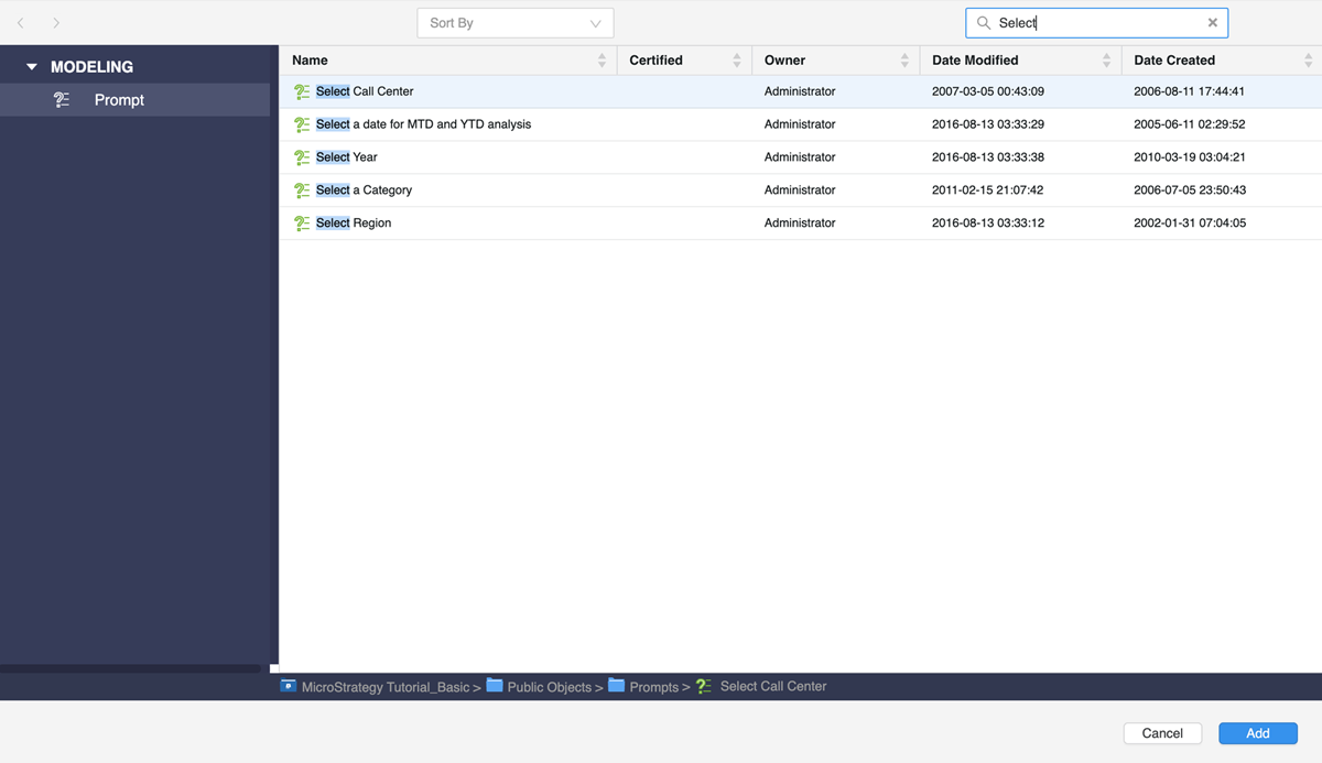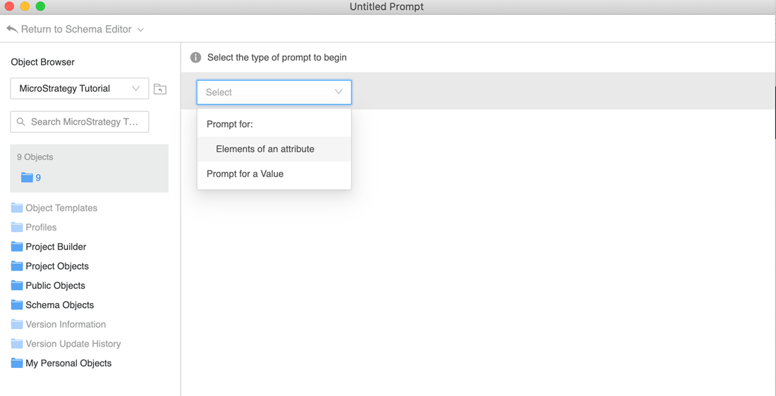 Select an attribute and complete the required fields. For more more information, see Create a Value Prompt to Select a Single Value and Create an Object Prompt to Select Objects to Display on a Report.
