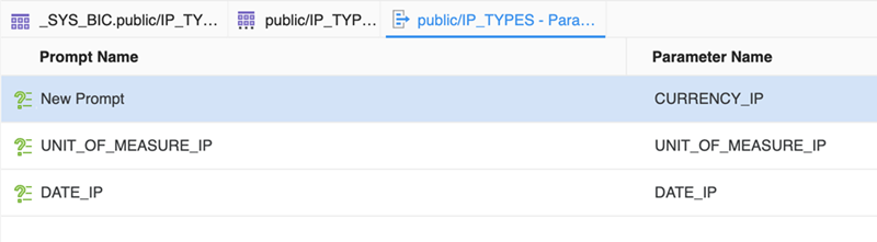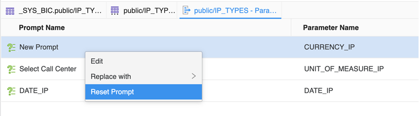 The "New Prompt" is reverted back to “CURRENCY_IP”, which is the original prompt when this SAP HANA table is initially imported.