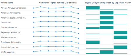 The modern grid shown below displays the number of flights and a bullet microchart for each airline name, that is, each row.