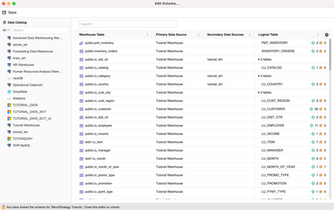 - In the Schema Editor, use the Data Catalog on the left to connect to data sources and retrieve warehouse tables. Add tables to the right to create tables for the project.