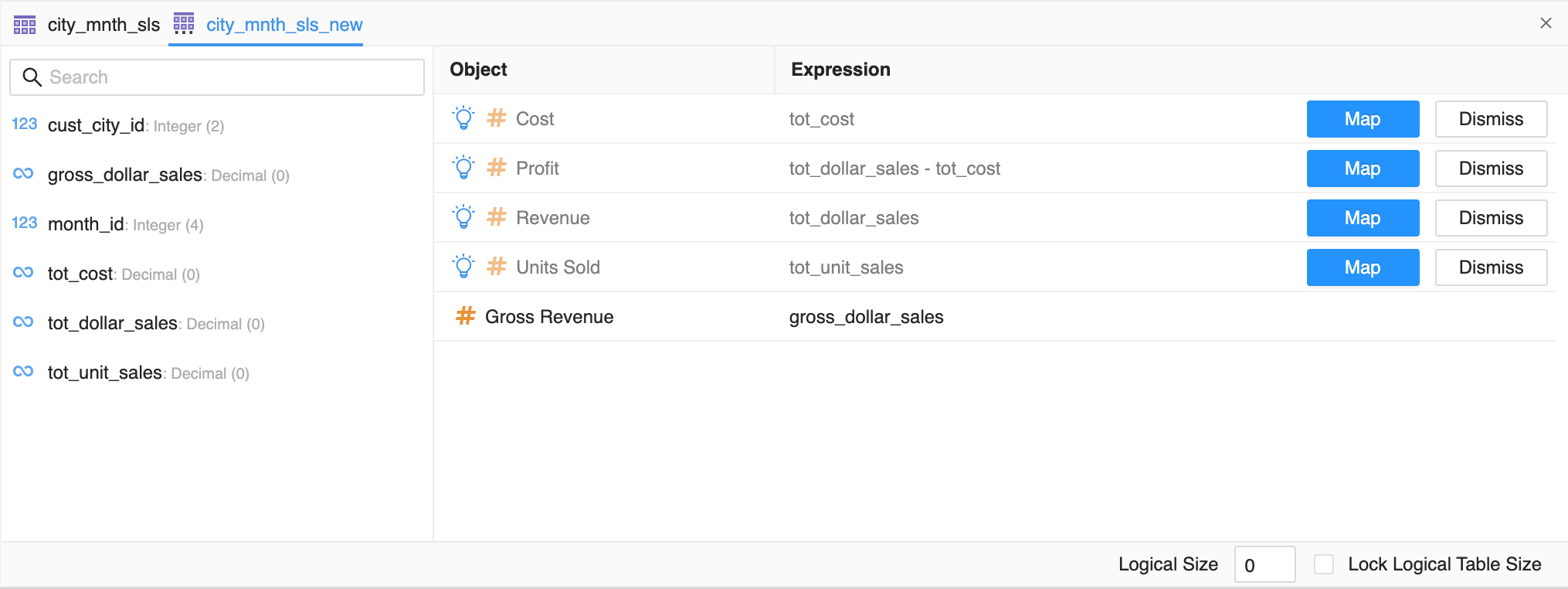 On the right, click the warehouse or logical table to preview the warehouse data or table definition. For newly created tables, the table preview displays recommendations to create facts. Click Map to map the column to an existing fact.