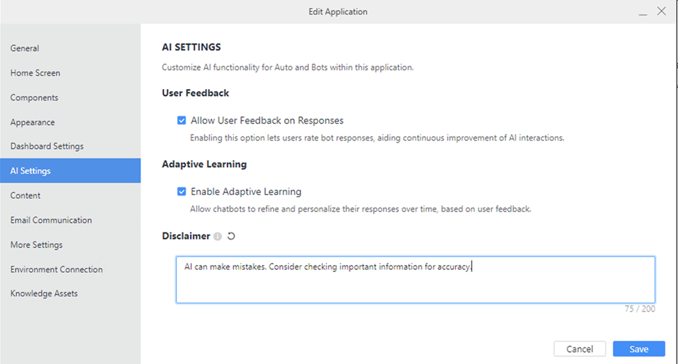 Application administrators can modify the footnote text, which updates across all Strategy AI products besides Auto SQL. Auto SQL retains the out-of-the-box footnote.