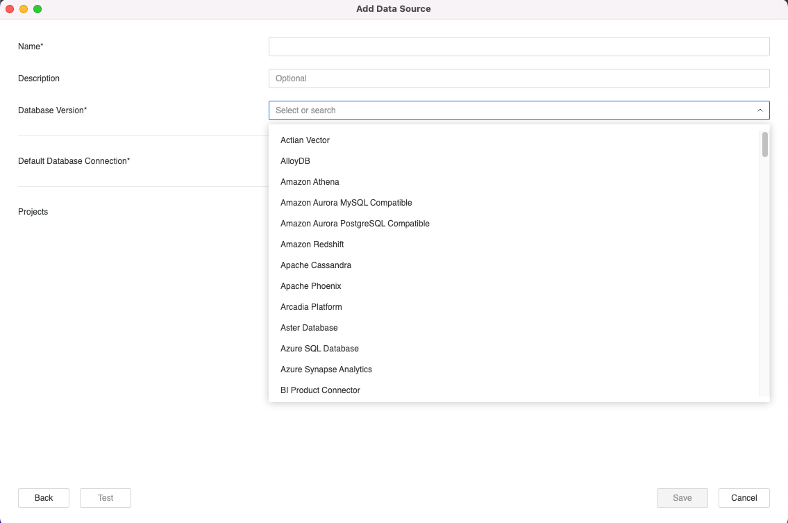 The list of database versions will contain all the versions supported by the Data Source Manager and the Generic DBMS that can be used for a database unknown to Strategy.