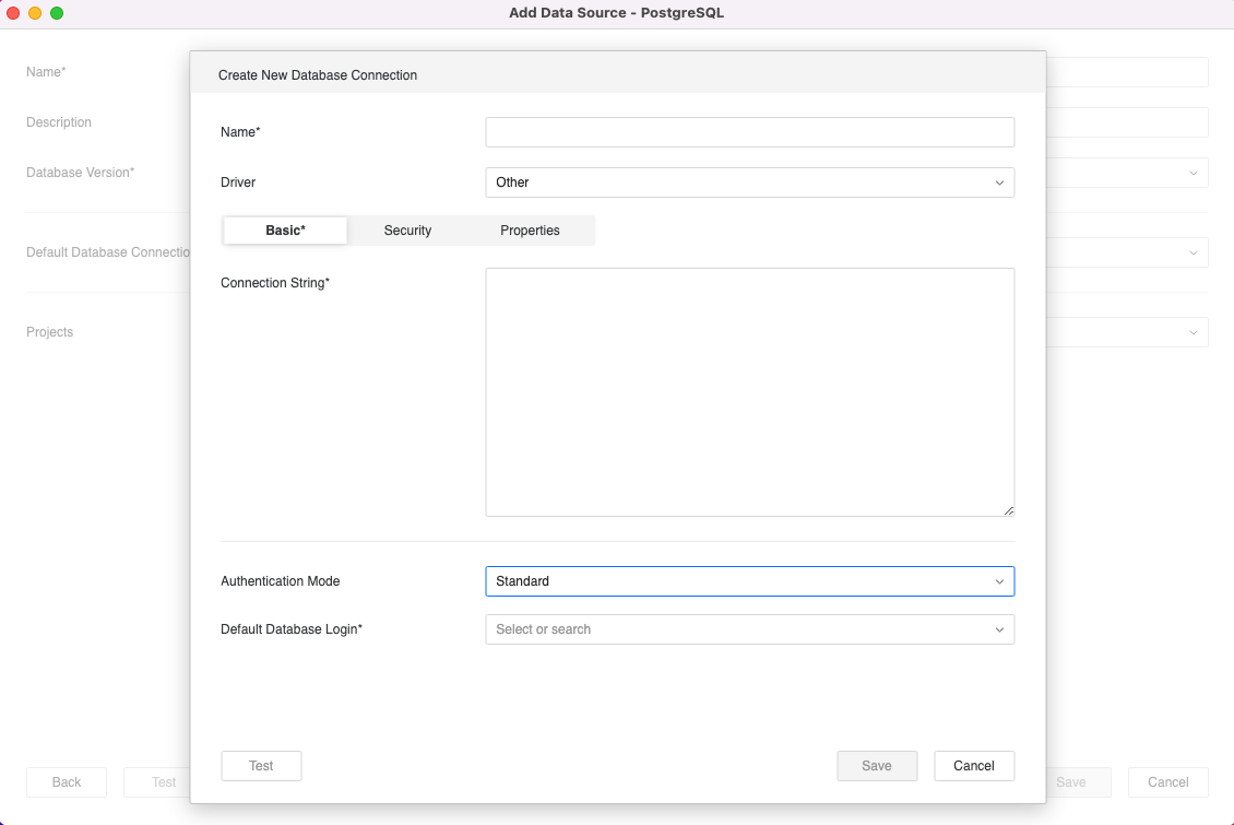 - If using Standard, enter a Default Database Login. If using OAuth or Single Sign-On, enter an Authentication Service.