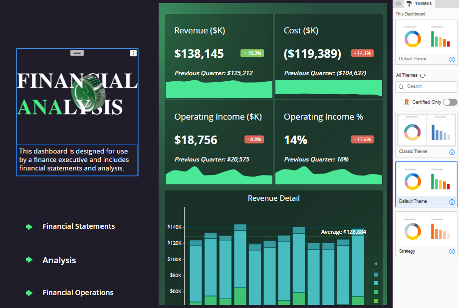 Library and Workstation users can apply a theme by a simply clicking to change the look and feel of their dashboards. This is much easier and efficient than changing the formatting in each visualization.