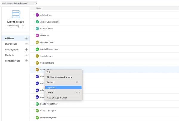 Starting in Strategy 2021 Update 8, you can duplicate user accounts to mimic access privileges. Duplicating a user profile eases the user creation work flow for multiple users that require the same access privileges. Duplicate user accounts have the same user groups, security roles, and privileges as the original user account.