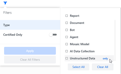.In the Data section, you can easily filter for different types of datasets, such as data import cubes, intelligent cubes, and live intelligent cubes, as shown below: