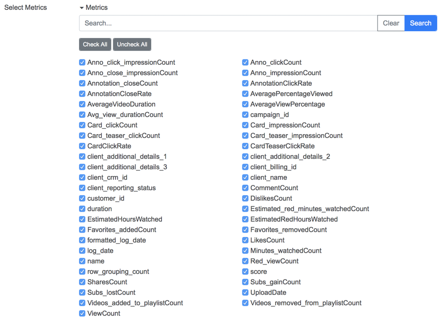 All metrics are checked by default. There is a live filtering field at the top. Enter or paste the name of the field you want to find.