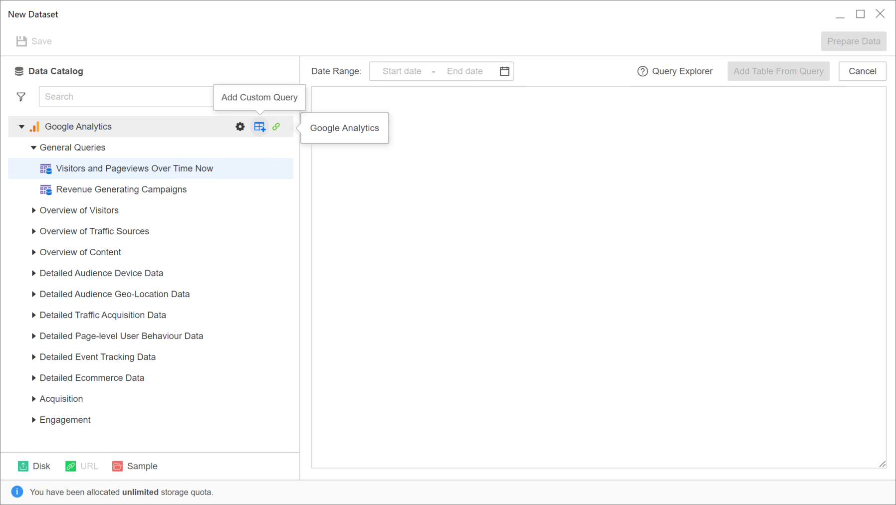 Hover over the Google Analytics data source and click Add Custom Query