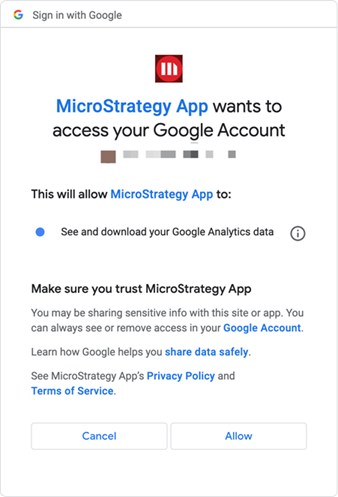 See KB483527: How to Configure Google API Data Import Connectors in MicroStrategy Desktop or Workstation for more information about how to configure the Google App.