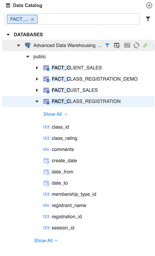 Expand a namespace to view all the tables within it. Expand a table to view all the columns within it. To search for a table, type its name in the Search box. The tables are filtered as you type.