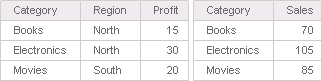 Notice that one dataset includes the Region attribute, however the other dataset only includes Category. The Region attribute is also not directly related to the Category attribute, but it is included with Category in one of the two datasets.