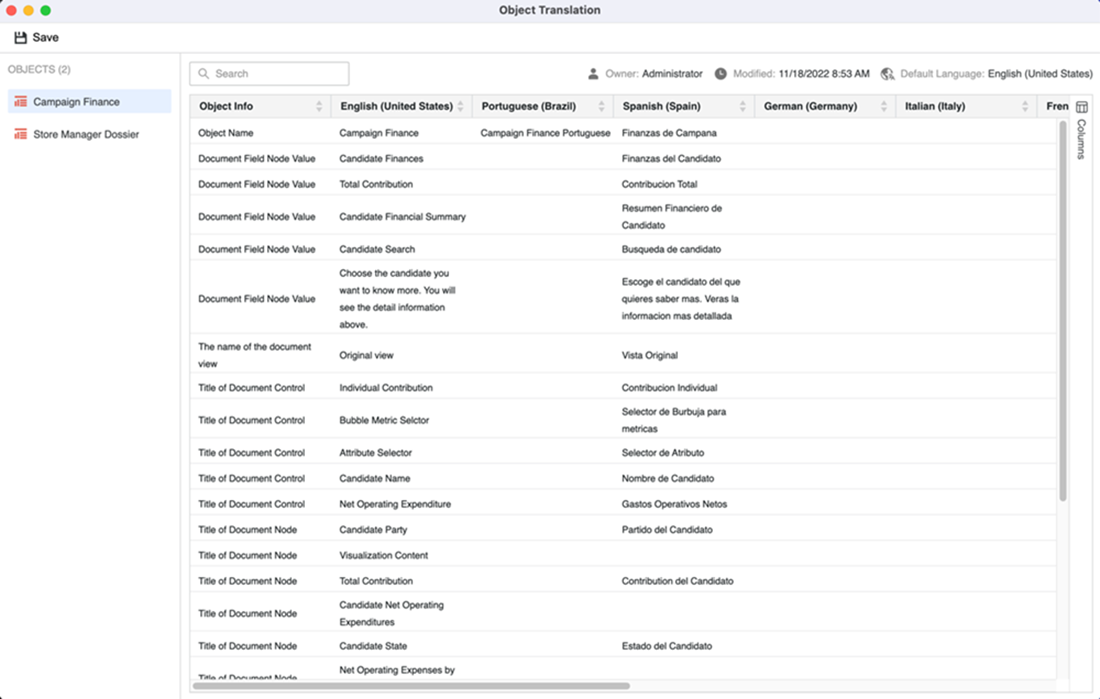 - In the Object Translation window, select the object that you want to translate. Once you select an object, translations for all supported languages appear.