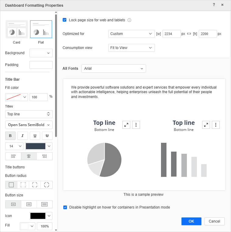 MicroStrategy ONE (June 2024) introduces a new dashboard formatting setting to lock a dashboard's page size. You can set predefined or custom ratios so the dashboard size updates responsively as you change your browser size. The length vs width ratio does not change for each component on the canvas.