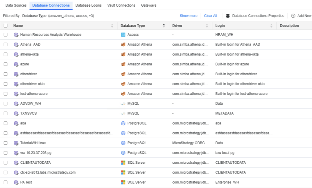 - Here you can add a new database connection, export the grid to CSV, or filter the grid by Name, Type, Driver, or Login.