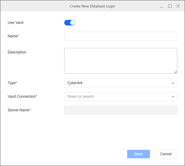 If you are using a vault secret-based database login, enable the Use Vault toggle. Before creating vault secret-based database logins, you should create vault connections first. Complete the remaining fields and click Save.