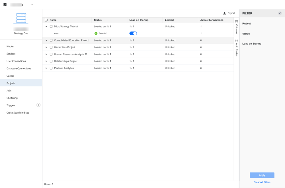 If the Platform Analytics project is configured and loaded, and depending on your Strategy version, you can view project details, including project name, status, loading status, and recent active user count. The Active Connections column shows the number of users who recently accessed the project based on the data collected in the Platform Analytics projects.