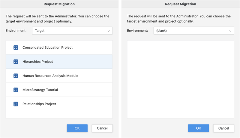 Choose the target environment and project. You can only select connected environments. If you do not have access to the target environment or project, you can leave this selection empty and the Administrator can fill it out before proceeding with the migration.