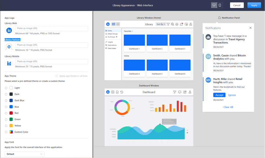 Starting in MicroStrategy ONE Update 10, you can configure the logo and color theme of Library Web via the application's Appearance Editor. Color preferences apply to collaboration, Strategy Insights, subscriptions, and search interfaces, as well as the table of contents.