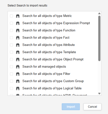 To import objects from a search, select one or more Search objects you created or choose from a default list of searches.