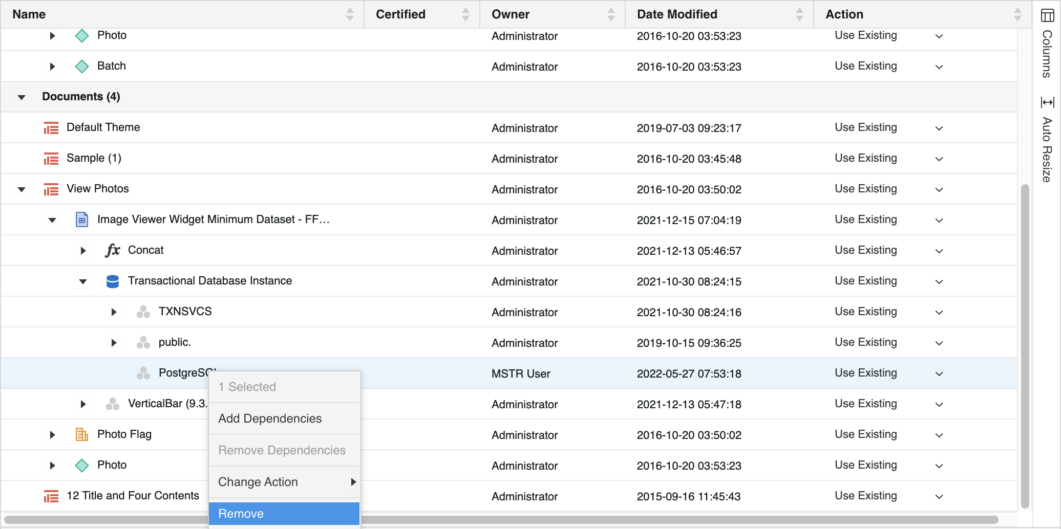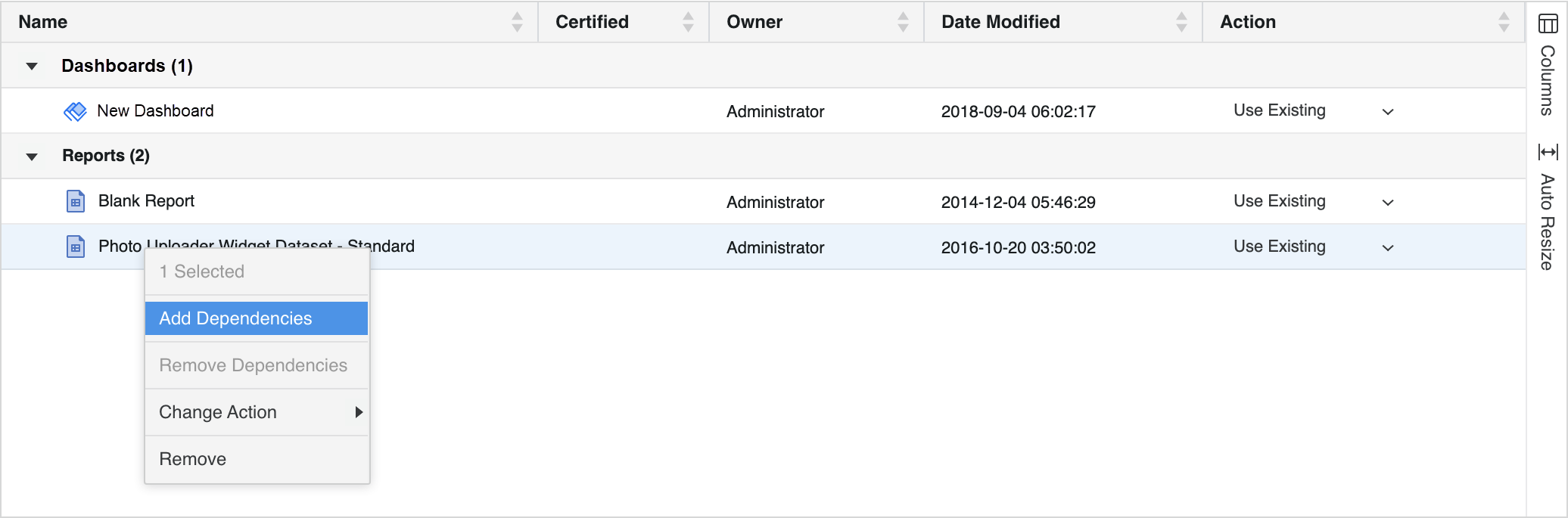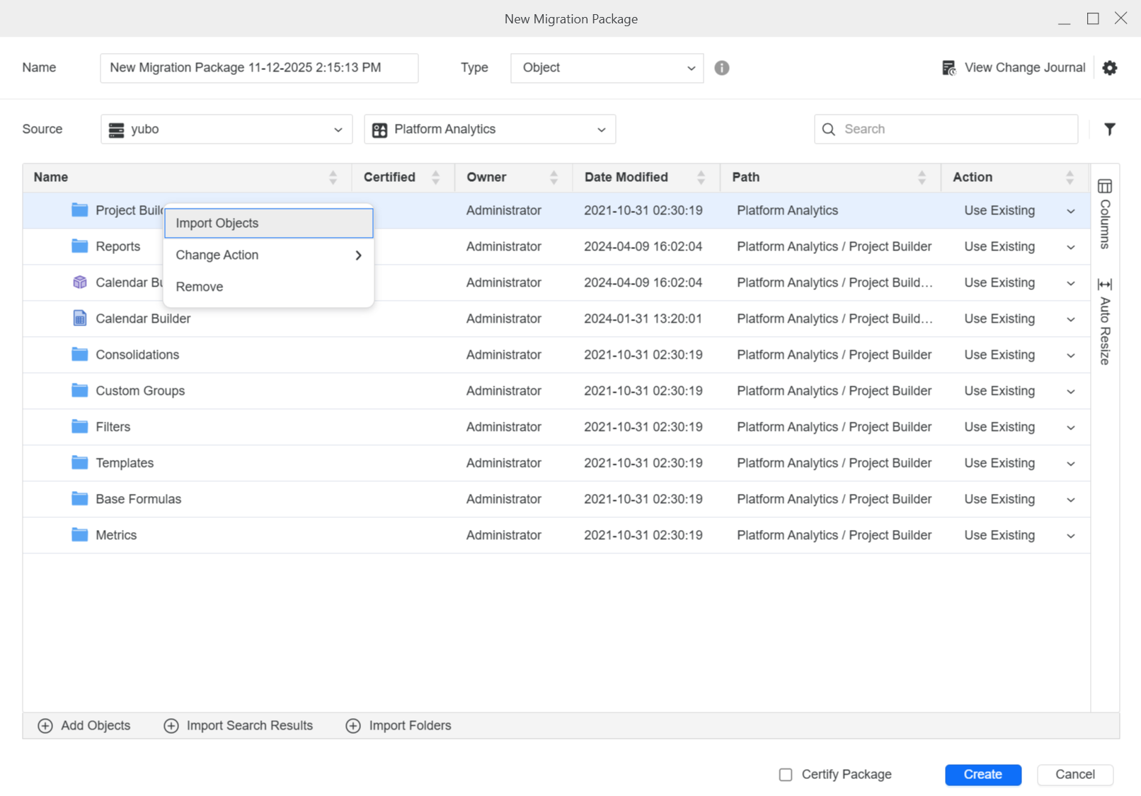 Once you have added objects, you can right-click them to Add Dependencies or Change Action based on your needs.