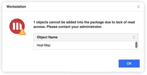 If the user does not have the read and browse ACL when creating a package, the object cannot be seen in the Add Objects dialog and an error appears when dragging and dropping objects into the Create Package dialog.