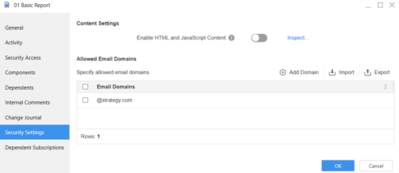 Before enabling it, you should inspect the content. Click Inspect to display any HTML and JavaScript content in the object. You can enable or disable each piece of content separately. Strategy recommends disabling custom HTML and JavaScript within HTML containers and grids.